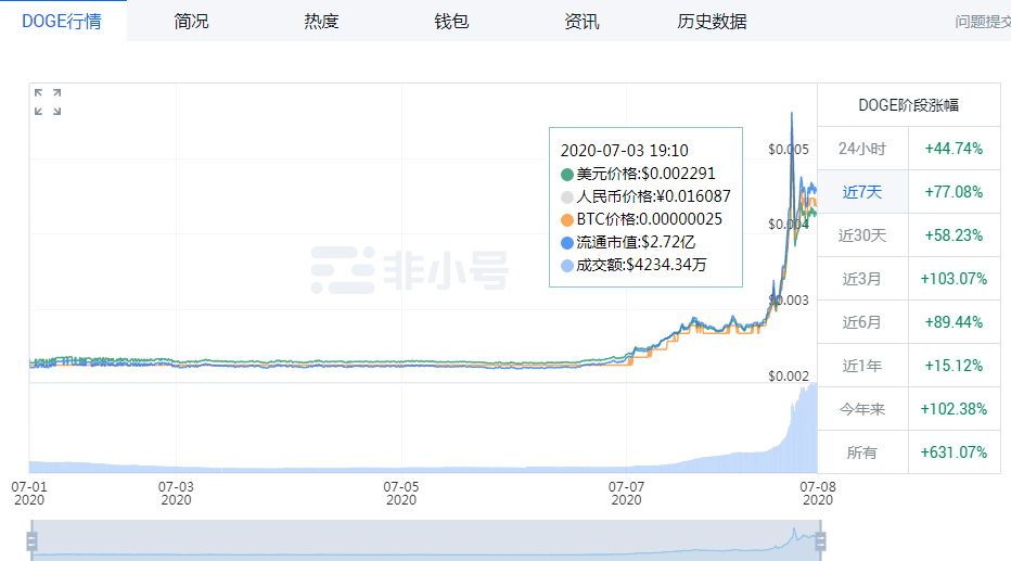 其实在此之前,小编也没想到,像“狗狗币DOGE”这种没有什么技术支撑的空气币项目竟然也会有涨幅这么大的一天,甚至拥有不少定力极强的铁杆粉丝。