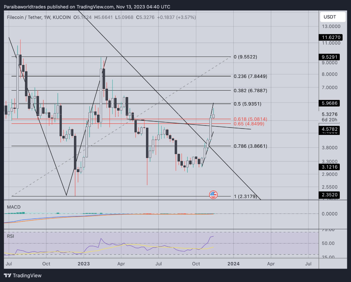 交易员Naemrr解释称,在最近的技术突破之后,Filecoin(FIL)价格的上涨可能会进一步持续。根据我们每周的斐波那契分析,FIL最近突破了黄金口袋水平。黄金口袋是关键的斐波那契回调区域,标志着价格走势的重大转变。他指出,这一突破是一个令人鼓舞的指标,提醒人们要保持谨慎,因为他们预计价格可能会大幅飙升超过这一水平。