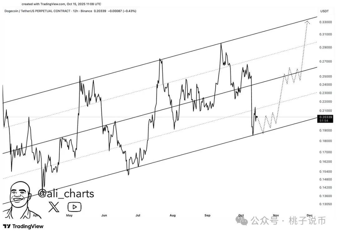 目前狗狗币价格正在重新测试该通道的支撑线,此位置的得失将成为短期走势的关键。