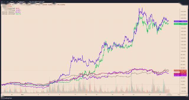 自 10 月以来,以太币的每周融资利率一直为正,截至 11 月 28 日约为 0.53%。