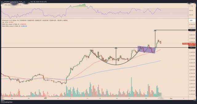 杯柄突破通常会投射出与杯深度相等的测量移动,使得以太币的上行目标接近 3,940 美元。