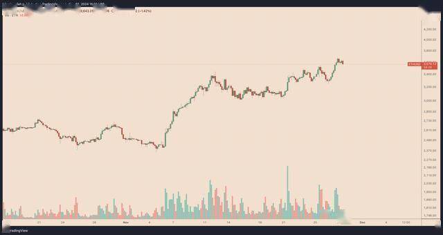 点击次数: ETH在过去 24 小时内上涨了 5.75%,于 11 月 28 日达到 3,640 美元左右。第二大加密货币的表现超过了加密货币市场的涨幅,后者在同一时期上涨了 2.82%。