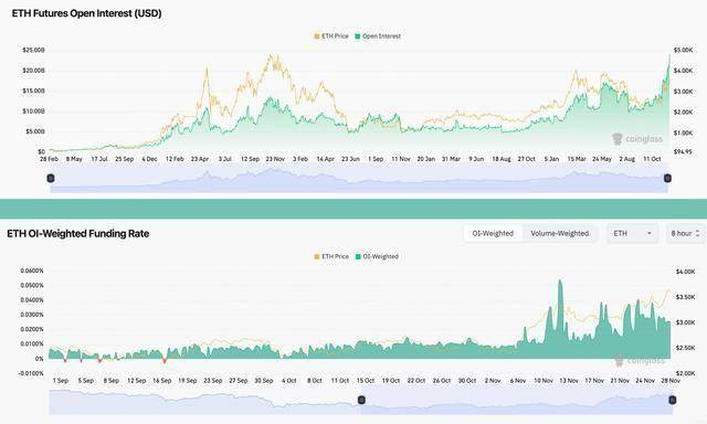 以太币价格上涨的同时,其期货市场未平仓合约 (OI) 也大幅上涨。截至 11 月 28 日,OI 已达到 240 亿美元,创历史新高,而过去 24 小时内,OI 上涨逾 40 亿美元。