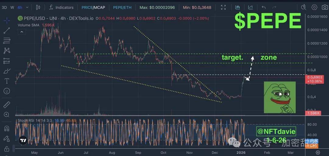 PEPE价格持续走强,正按预期走势,从上方阻力线(白色)干净利落地反弹。如果上涨势头得以延续,下一步将是突破目标区域(绿色),届时价格将吞噬一个零,$PEPE将向 0.000010 美元迈进。