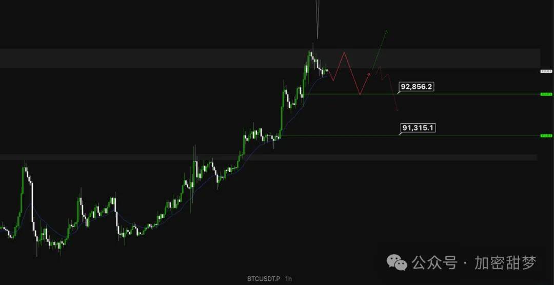 1小时级别,建议94000做空,止损95000,止盈91000附近。 周线级别,macd金叉向上,大周期有反弹需求,回踩可以继续做多。但是形态上还是空头,压力98000附近可以考虑开空。