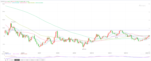 美元指数上周呈现震荡反弹走势,1月9日最高涨至99.26,本周一亚洲市场美指在短暂冲高99.24之后掉头向下,目前围绕98.95附近波动。日线观察,虽然短期美指呈现技术反弹走势,但始终未能有效突破短期阻力99.00的技术压制,后期需要关注的是即便短期给予突破,但要涨至去年11月高点100.39之上也存在一定的难度。而值得警惕的是一旦美指遇阻回落,首先留意12月24日低点97.74的低点支撑,该位置如被有效跌破,中期将向着96.21位置靠近。