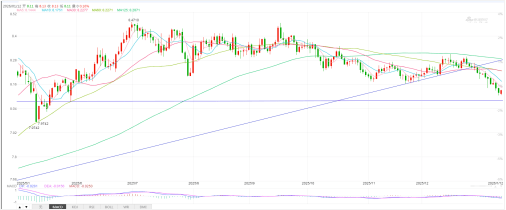 美元兑人民币周线图可见,2023年9月最高涨至7.3498,2025年4月最高触及7.3515,两次冲击7.3500之后迎来下行走势,技术上形成大型双顶形态,该形态关键的颈线月低点7.0090,去年12月迎来破位走势之后持续呈现下行走势,本周一亚洲市场最低跌至6.9744,人民币升值行情保持较好。目前美元兑人民币下跌趋势延续,中短期再度突破7.0090的概率较小,汇价其后大概率还会继续选择下行,此轮下跌的中期目标位于2023年1月低点6.69附近。鉴于目前行情波动幅度较大,因此仍需对于实时行情高度关注。支撑位:6.9744;阻力位:7.
