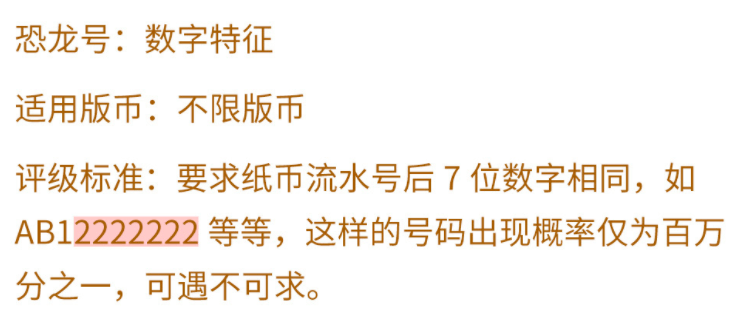 恐龙号是指纸币上的号码尾数7位为相同数字,这样的编号在纸币中极为稀有,一般情况下只有在冠号中才能找到一个。