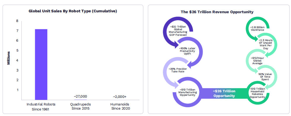 市场增长:报告指出,机器人技术将创造约26万亿美元的市场机会。这为机器人制造商和AI集成商提供了巨大的市场潜力。