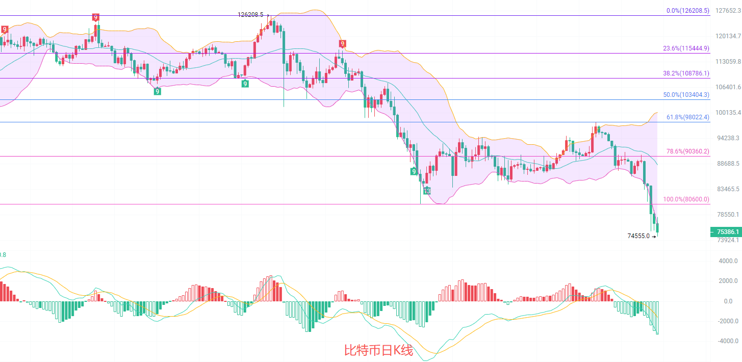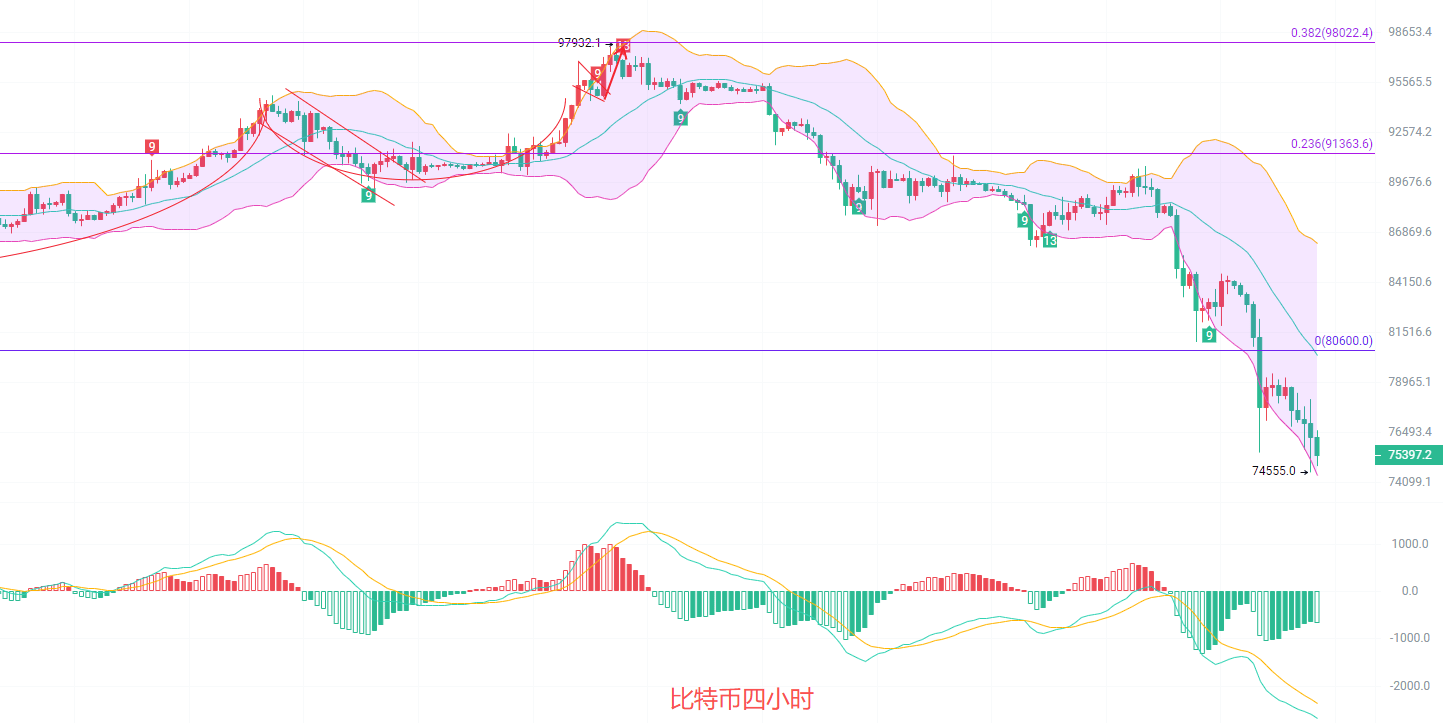 日K线,EMA趋势指标向下扩散空势不变,EMA15快线,MACD连续缩量增筹,DIF和DEA向下扩散开口,布林带下轨关注75500还在破新低,整体趋势上处于大空趋势,但是RSI已经抵达了极端超卖,也就是说行情有反弹的需求,这种行情随时出现背离,主力高度控盘期间跟游资已经没有关系了,