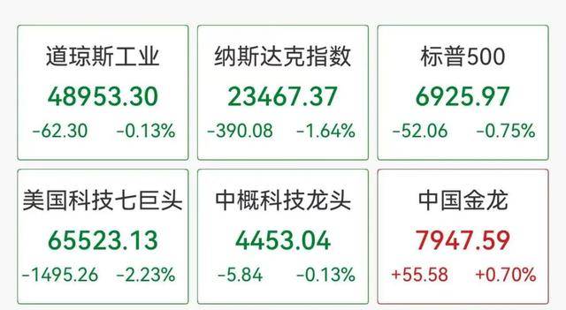 同时,北京时间29日晚,美股三大股指全部下跌,截至发稿,道琼斯指数跌0.13%,标普500指数跌0.75%,纳斯达克综合指数跌1.64%。