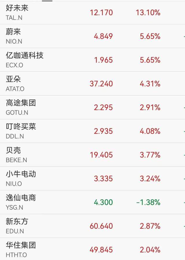 中概股涨跌不一,好未来涨超13%,其2026财年第三季度业绩超预期。蔚来涨超5%,亚朵、叮咚买菜涨超4%,阿里巴巴涨约1.5%。