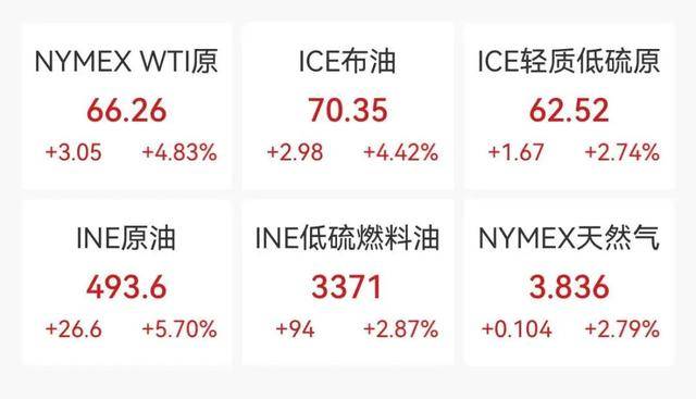 国际油价大涨,ICE布油价格大幅跳涨超4%,自去年9月以来首次触及每桶70美元;WTI原油涨超4%,报66.26美元/桶。
