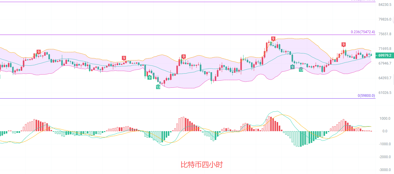 四小时K线短期内已经站稳了EMA15和30还有60,至于EMA90和120走平,南下趋势终结,北上已经接管了市场,这个时候我们要做的只能是顺势而为,布林带中规69850,下轨上移到了68500,下跌空间在压缩,若上轨71200时候行情有很大概率冲击74000,MACD顶部背离,行情在高位收缩,思路上短期还是以北上为主,南下为辅