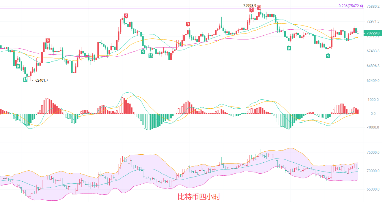日线空头框架未破,反弹仍为修复,大周期趋势依旧偏空,价格从75998高点下跌后,反弹至斐波那契 0.786阻力位74011便遇阻回落,当前在70880 附近磨底,并未突破前期下降趋势线,属于超跌后的技术性修复。MACD 绿柱虽有收窄,但 DIF 仍在零轴下方,说明南下仍占据主导。K线 均线继续向下压制,均线南下排列未被打破,大周期趋势未改。