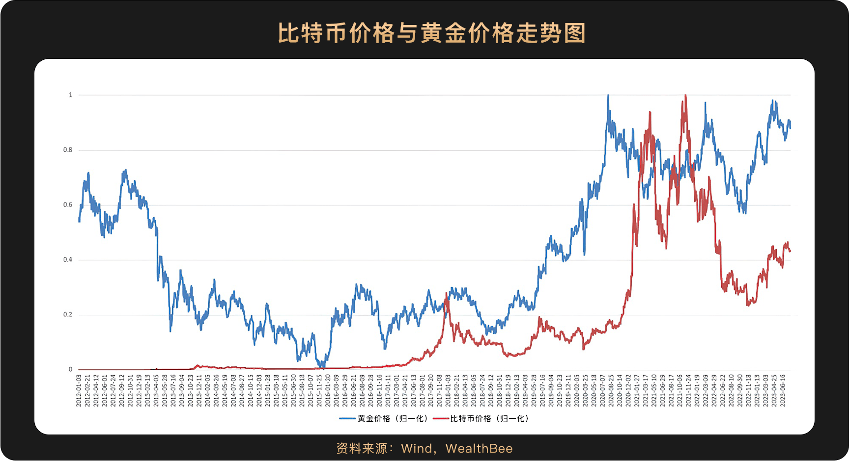 我们选择伦敦现货黄金(XAU)作为黄金价格走势锚定来分析。黄金属于典型的避险资产。从图中看,在2016年之前黄金价格在逐步降低,但比特币价格却在缓慢升高。随后二这走势呈现趋同性,在2018年二者均达到阶段高点,2020年8月,黄金价格达到最高点随后回落,但比特币价格却在之后迅速走高,进入大牛市。比特币价格巅峰恰恰是黄金价格的阶段性低谷(2021年)。但在2022年11月之后,二者同时触底反弹,走势上表现出一致性。