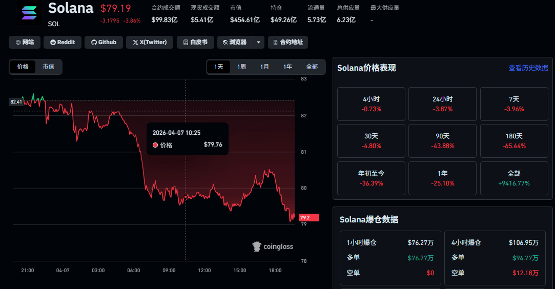 Solana是这轮最惨的。生态上的Drift Protocol被黑2.85亿美元,市场信心直接打穿,SOL从83美元一路被按到79-80美元附近,领跌主流币。DeFiLlama数据显示Solana全网TVL从90多亿美元一路滑到55-60亿,Glassnode数据显示72小时内就有140万枚SOL涌入交易所,抛压很重。