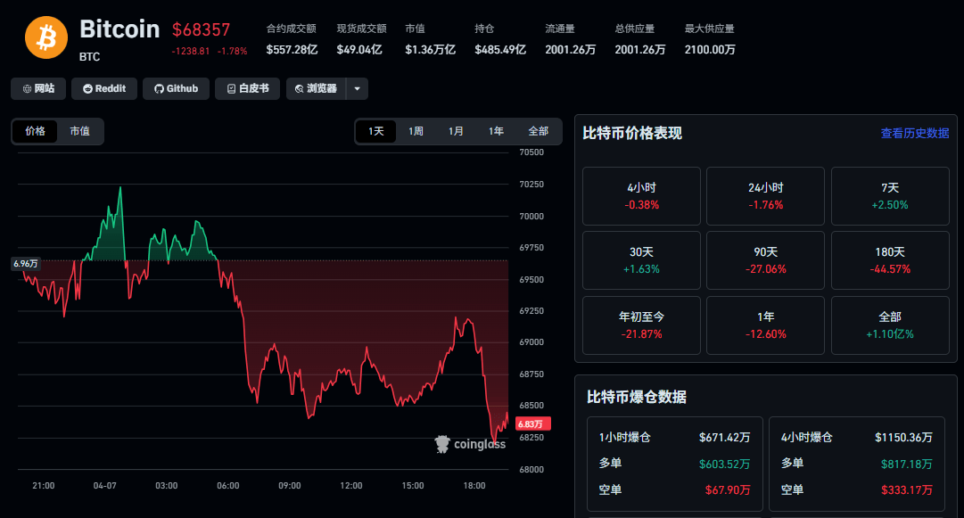 先看比特币。现在价格大概在68,500到69,000美元区间震荡,今天早盘受消息刺激一度冲上70,300美元,但很快就被打回来了,收了一根长上影线万美元上方抛压确实重。MACD这些指标还在低位转悠,日线美元的大箱体震荡中,没有趋势性突破。