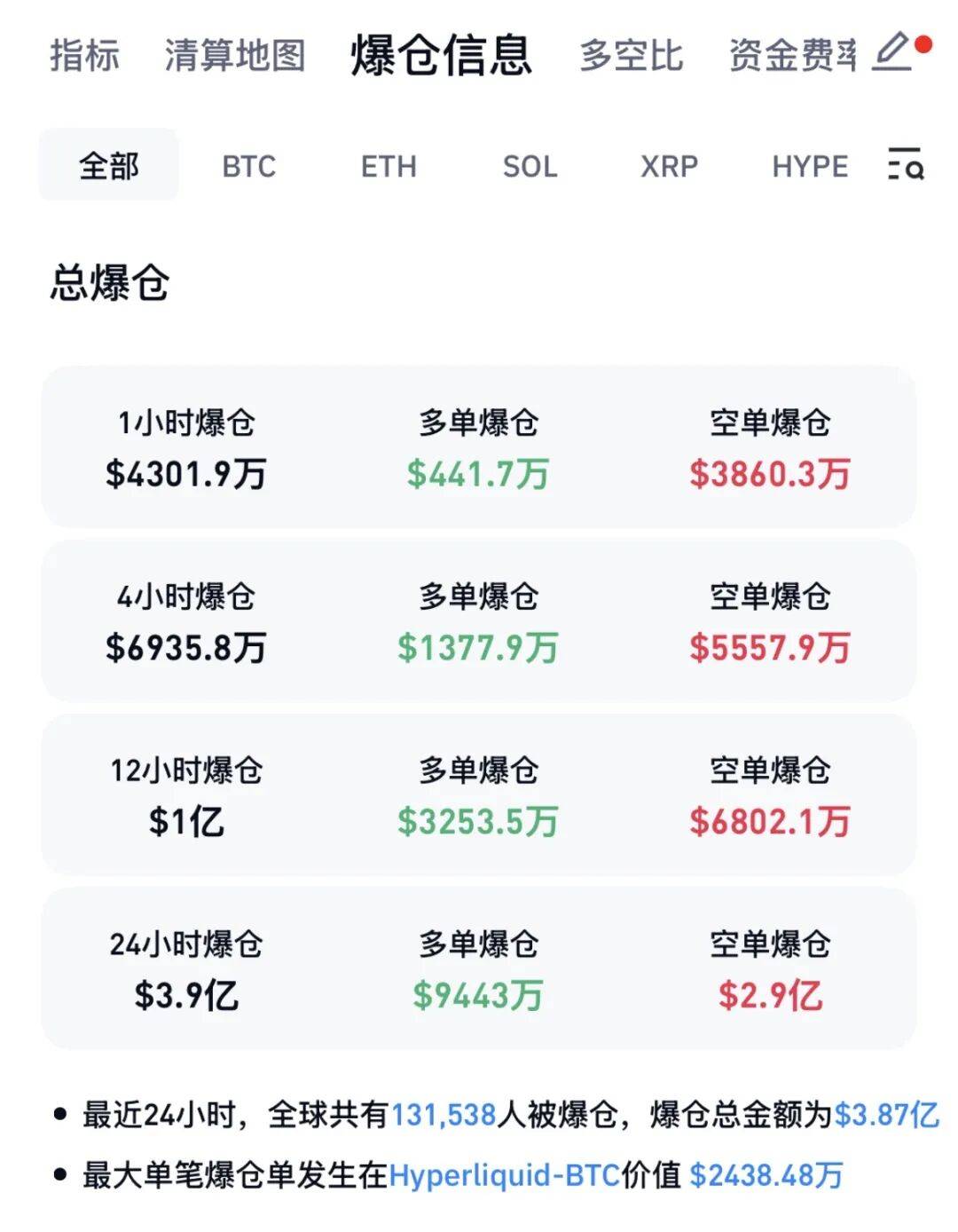 CoinGlass数据显示,过去24小时,加密货币市场共有超13万人爆仓,爆仓总金额为3.87亿美元。