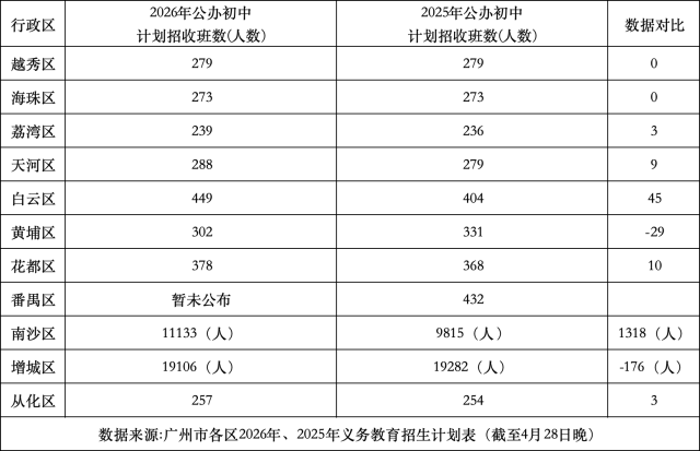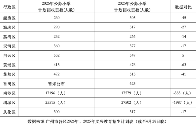 从广州各区已公布的数据来看,2026年广州义务教育阶段的公办学位供给呈现出明显的“小学收缩、初中扩容”分化态势。