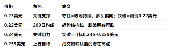 日收盘高于0.24美元且交易量扩大,将转为支撑,延伸至0.245-0.25美元,动量账户追逐或推向0.255美元。