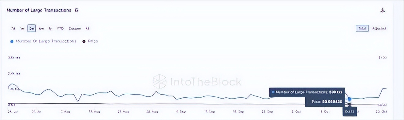 在过去三个月中,狗狗币的鲸鱼交易活动达到了顶峰。从10月14日到23日,狗狗币价格大幅上涨了20%。链上数据表明,鲸鱼对这个市值最大的模因币重新产生了兴趣,这是推动价格上涨的主要动力之一。
