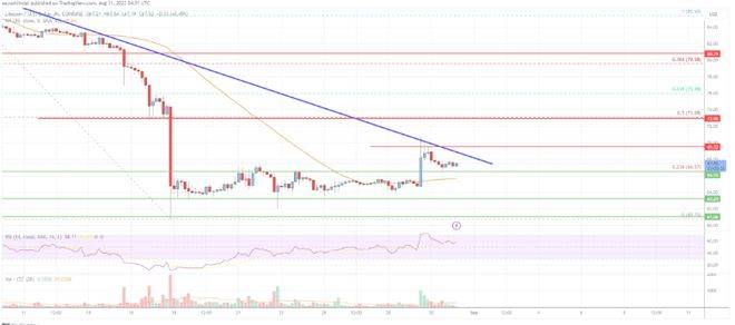 早些时候,莱特币在60美元上方形成了底部,价格在62美元和64美元上方开始反弹。这一反弹幅度超过了从85.40美元波动高点跌至60.75美元低点的23.6%斐波那契回撤位,给人留下深刻的印象。