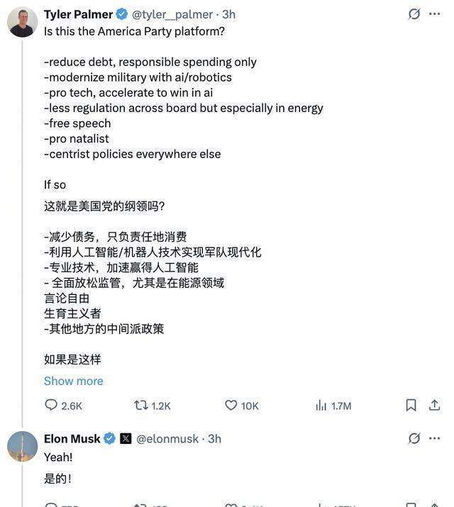 不少网民猜测着,“美国党”的政治纲领很可能包括削减债务开支、推动人工智能技术的加速发展、以及全面放松监管等方面。对此,马斯克表示:“没错!”
