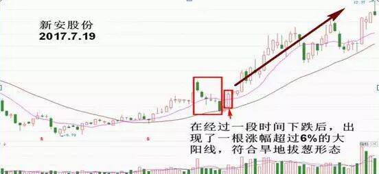 “旱地拔葱”的表现为经过连续的下跌或者是回调,当反弹或反转的走出的第一根阳线%以上的大阳线。
