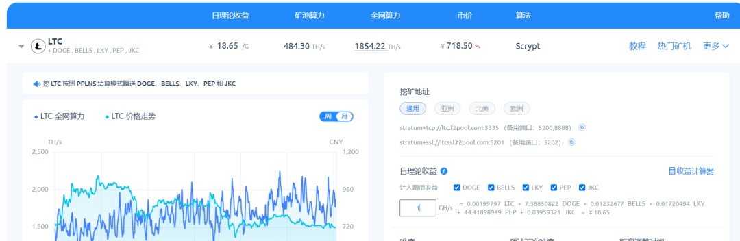 狗狗币与 LTC 紧密绑定,通俗来讲,就是挖 LTC 会赠送 DOGE,同时还会赠送 BEL、LKY、JKC、PEP 等小币种。虽然每个矿池的赠送机制有所不同,但主要收益来源还是 LTC 和 DOGE,其他小币种的收益相对较少,所以无论选择哪个矿池进行挖掘,收益差距都不会太大。以鱼池为例,按照当前币价及全网算力计算,狗狗币机型单 G 收益可达 18.65 元。